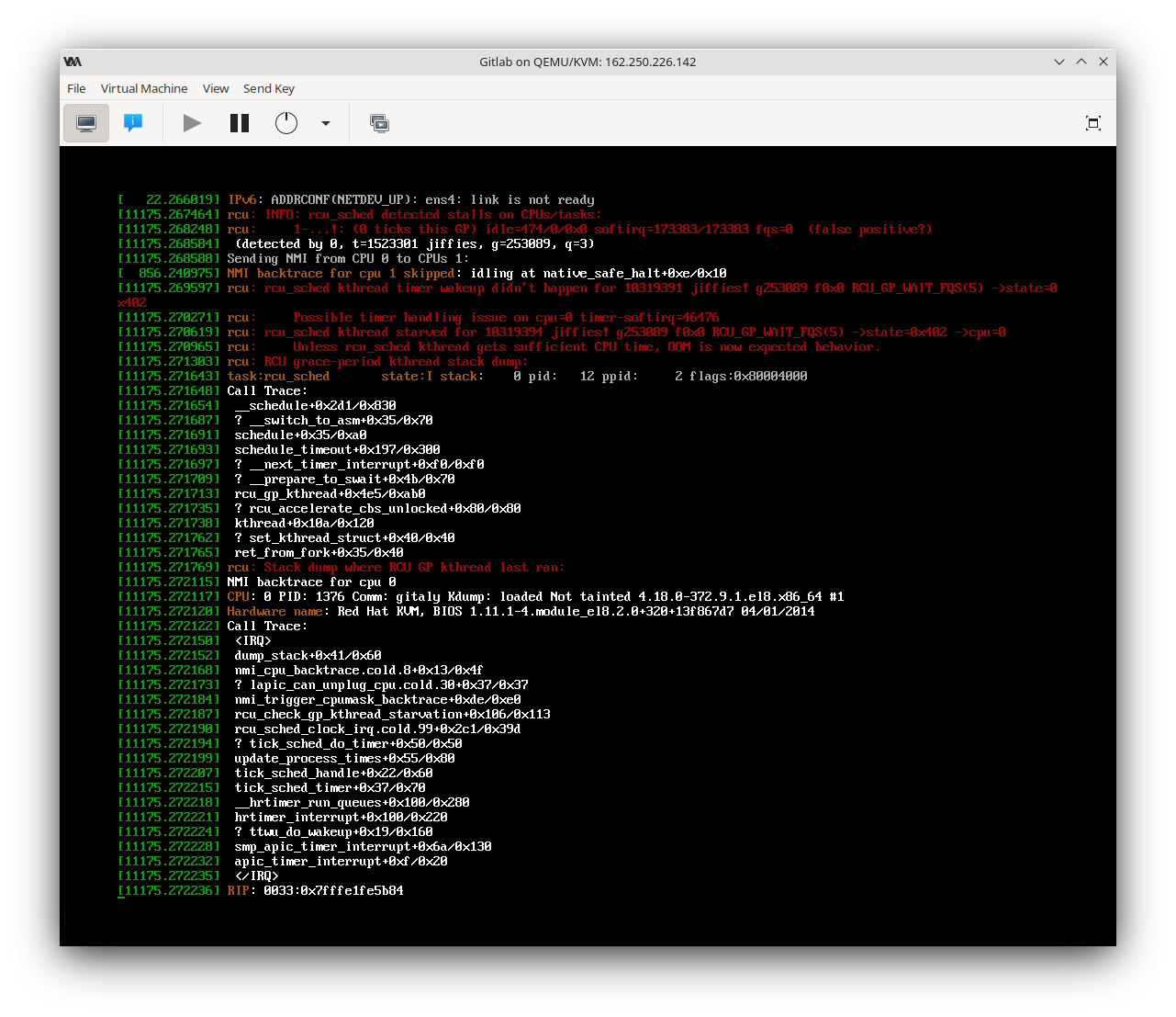 | Description | Multiple times on two separate servers, qemu-kvm processes have suddenly spiked to 100% usage, and the VMs represented by those processes have become unresponsive to the point of needing force-power-cycled. Multiple VMs enter this state at the exact same moment. In two cases, the VM has recovered after multiple minutes, and in both cases, the VM's system clock was set in the future. It seems that the longer the hang goes on, the further in the future, as one machine thought it was the year 2217. Dates were correct before the hangs. These servers were running CentOS 8 before converting to Alma, and didn't exhibit this bug on CentOS. The hanging VMs have also all been running Alma 8, though that's likely coincidence, as that's most of my VMs now. There hasn't been anything notable in the host machine's dmesg or logs that I have seen. | ||||